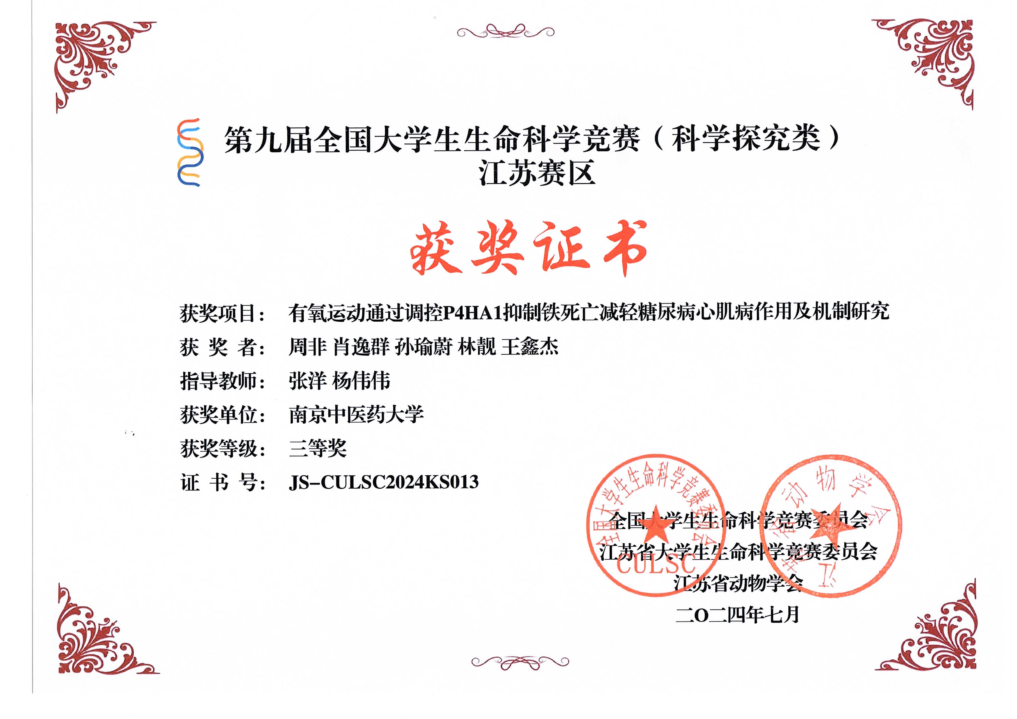 第九届全国老员工生命科学竞赛(CULSC)(包含科学探究类,创新创业类两条赛道)于7月中下旬落下帷幕。公司康复系张洋老师、杨伟伟老师指导的“有氧运动通过调控P4HA1抑制铁死亡减轻糖尿病心肌病作用及机制研究”项目在科学探究类赛道,荣获江苏省赛区三等奖。