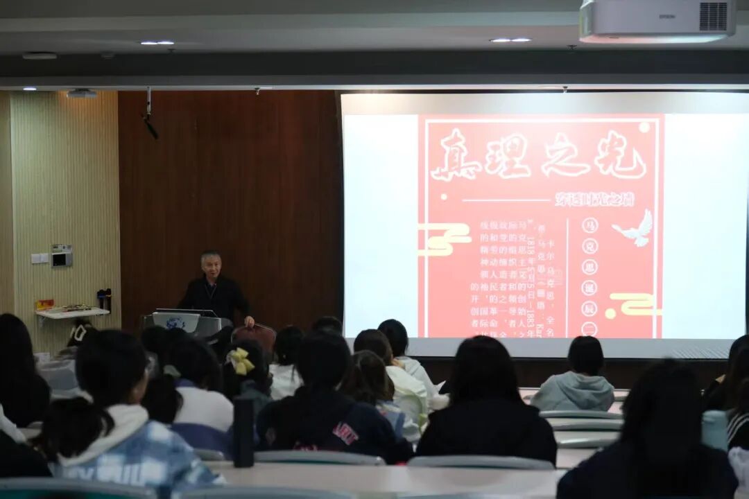 讲座中,陈方平老师以深厚的理论素养和开阔的学术视野,系统阐述了马克思主义创始人卡尔·马克思的思想体系。他围绕指导思想、学术成就、理论勇气与人格魅力四个维度层层展开,将马克思的人生轨迹与理论贡献娓娓道来,使这位思想巨匠的形象跃然于课堂,理论的光芒照进现实。